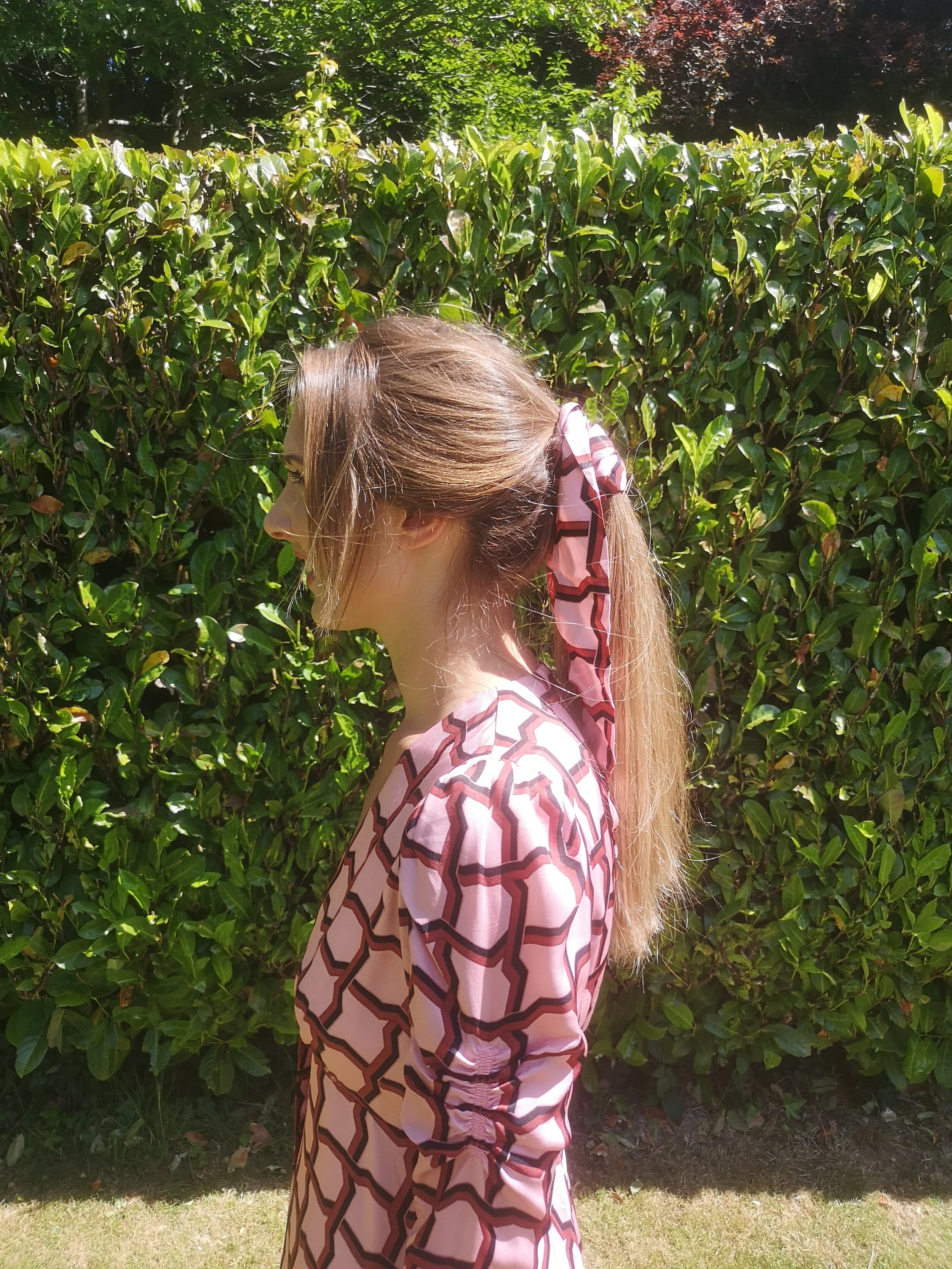 Step 4: Tie round a stunning scarf to add a pop of colour and interest. If scarves aren’t your thing attach a hair clip above your ears to elevate your pony.