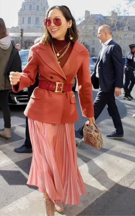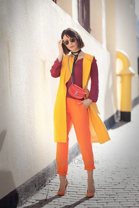 It’s a really effortless way to begin wearing mixing colours without drawing too much attention to your outfit. The colours harmonise with each other because they are literally side by side on the colour wheel. Again it's a graduation from monochromatic and block colour as youll be wearing different colours that are very cose to each other.
