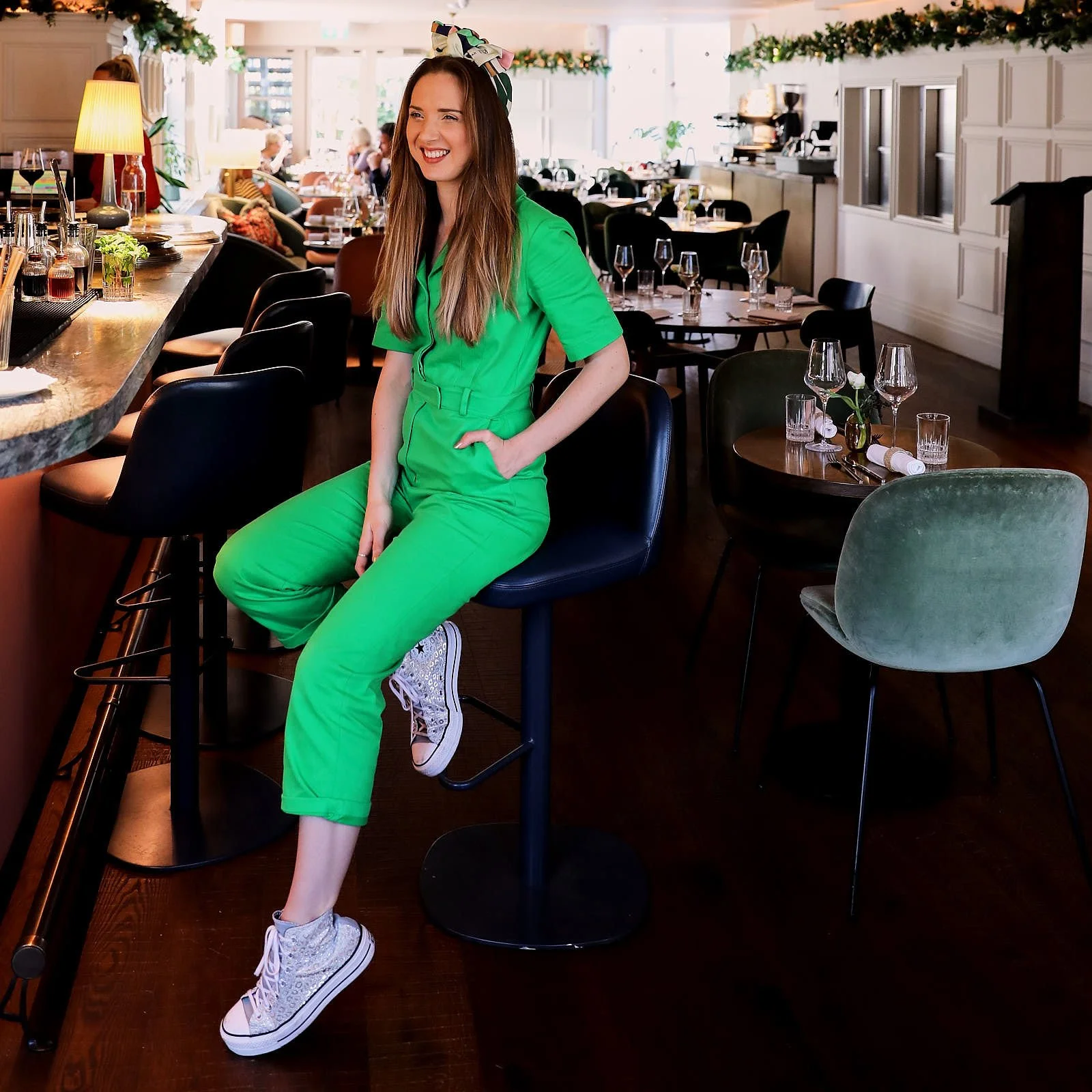 Style Notes; My final reference to the khaki jumpsuit is a red jacket, red shoes and red lips! The brighter the better with complementary colour schemes, not for the faint hearted!